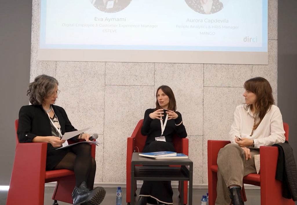 Para finalizar el encuentro, se realizó una mesa de debate moderada por Laura Verazzi, en la que Eva Aymamí (Digital Employee & Customer Experience Manager ESTEVE) y Aurora Capdevila (People Analytics & HRIS Manager MANGO) analizaron la convergencia entre personas, cultura y tecnología, coincidiendo en que la alianza estratégica entre los departamentos de Tecnología (IT) y Comunicación Interna es el factor crítico para el éxito de la digitalización, donde IT actúa como «arquitecto» y Comunicación como la palanca de gestión del cambio que explica el «para qué» a los empleados. Ambas ponentes enfatizaron que la adopción de la Inteligencia Artificial no es un desafío técnico, sino una transformación cultural que requiere vencer miedos y modificar hábitos arraigados. Aunque reconocieron que el apoyo de la dirección (enfoque top-down) acelera la implementación, destacaron que la curiosidad y el pensamiento crítico son las habilidades humanas insustituibles que permitirán la evolución de los roles profesionales en lugar de su destrucción, desmitificando así el temor a los despidos masivos y comparando este cambio con la evolución vivida en la revolución industrial.